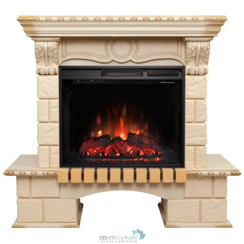 Каминокомплект включает в себя обрамление Bolero - дуб белый с золотой патиной + камень и функциональный очаг Sparta 25,5 LED
