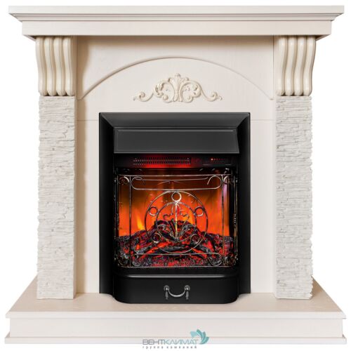 Каменный портал Corfino изготовлен из из искусственного камня и шпонированного МДФ. Очаг с открытым муляжом выполнен в точной копии тлеющих углей и небольших поленьев. Оригинальности и схожести с натуральным камином добавляет ажурная кованая решетка и звук потрескивания дров.