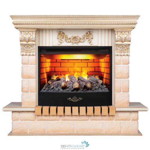Каменный портал Gracie 25.5 в цвете белый дуб с золотистой патиной. Представлен с очагом 3D Firestar 25,5.