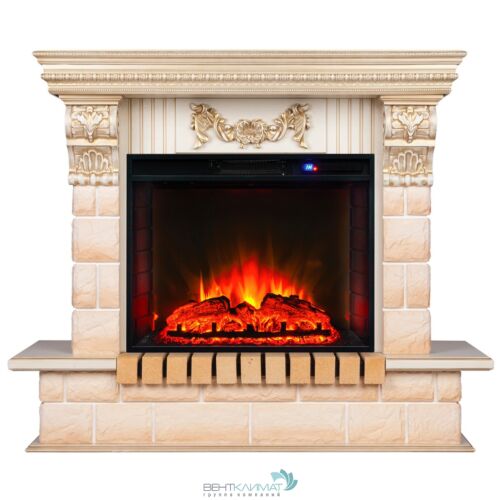 Электрокамин Gracia 25,5 WT с широким очагом Sparta 25,5 в стиле "кантри". Изготовлен из искусственного камня и шпонированного МДФ. Цвет шпона - белый дуб с золотистой патиной, камень белого цвета гармонично дополняет камин.
