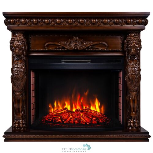 Обрамление из шпонированного МДФ в стиле барокко, в цвете "античный дуб" AO с очагом Firespace 33 SIR. Очаг с функцией инфракрасного обогрева и пультом управления. Панорамное стекло очага вкупе с реалистичным муляжом дров, гармонируют с эффектным пламенем.